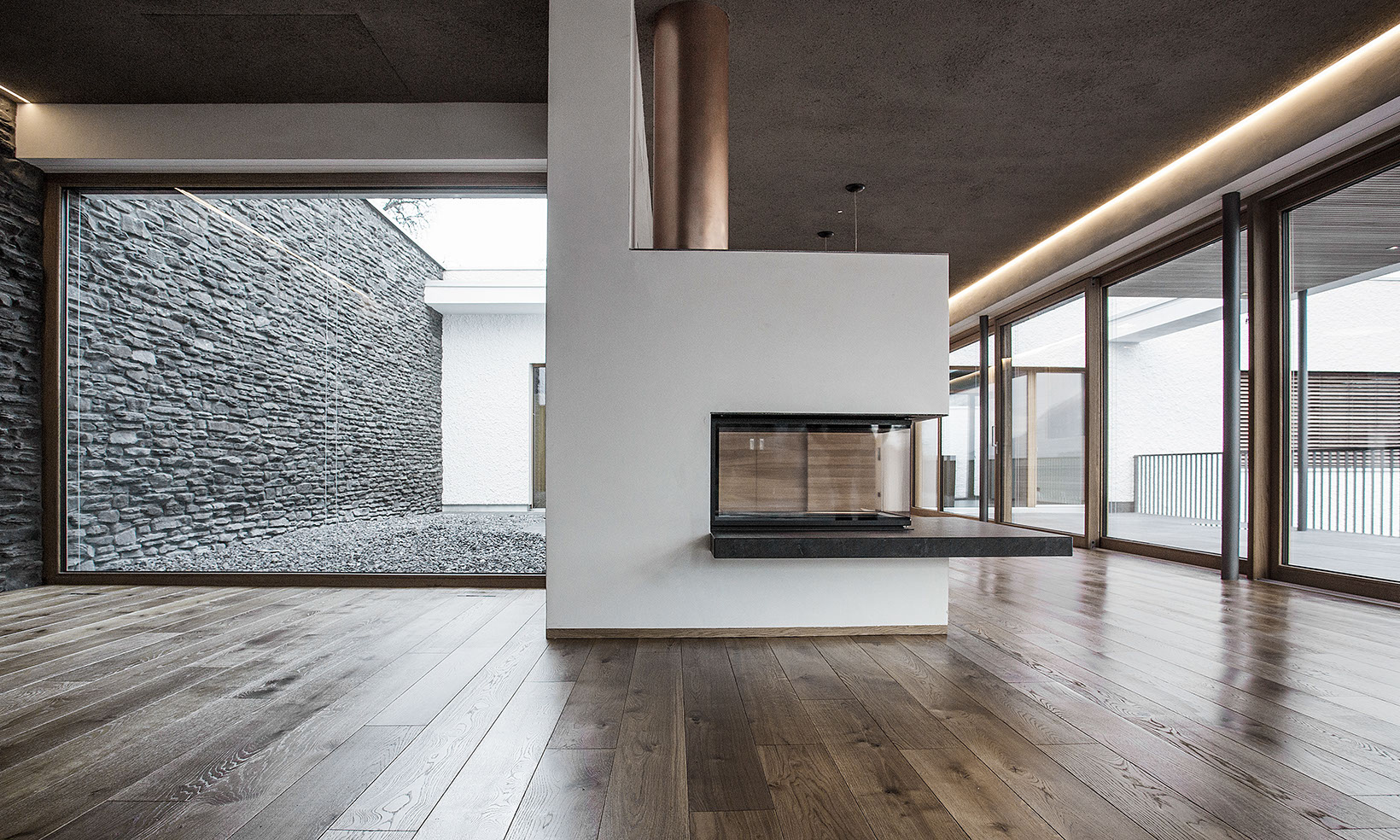 Das Einfamilienwohnhaus ist auf einem nach Süd-Osten orientierten Hanggrundstück in Feldkirch-Levis gelegen. Der Neubau staffelt sich in vier Ebenen dem Hangverlauf folgend. Über eine Zufahrt von der Straße erreicht man den Vorplatz mit Garage, Lager und dem zurück versetzten Hauseingang. Das Erdgeschoss, welches völlig eingegraben im Hang sitzt, umfasst Lager sowie Technikräume. Das 1. Obergeschoss beherbergt die Schlafräume mit Bädern und Ankleiden. Außerdem ist hier ein Gästezimmer, ein Büro, sowie hangseitig die Waschküche platziert. Die Schlafräume orientieren sich talwärts zu einer großen Terrasse. Das Wohngeschoss ist im 2. Obergeschoss untergebracht. Hier erstreckt sich ein großzügiger Wohn/Essbereich mit offenem Kamin, sowie die Küche. Hangseitig gliedert sich ein Innenhof an den Wohnbereich an. Talseitig befindet sich eine große teilweise überdeckte Terrasse mit wunderschönem Ausblick über die Stadt Feldkirch. Über dem Stiegenhaus erhellt ein großes Oberlicht den Gang und das Stiegenhaus. Das Einfamilienhaus wurde in Massivbauweise erstellt. In den Fassaden wechseln Flächen von Naturstein und weißer Putzfassade ab. Die Stützmauern des Untergeschosses wurden in Sichtbeton ausgeführt, welche mit Rankpflanzen bewachsen werden.