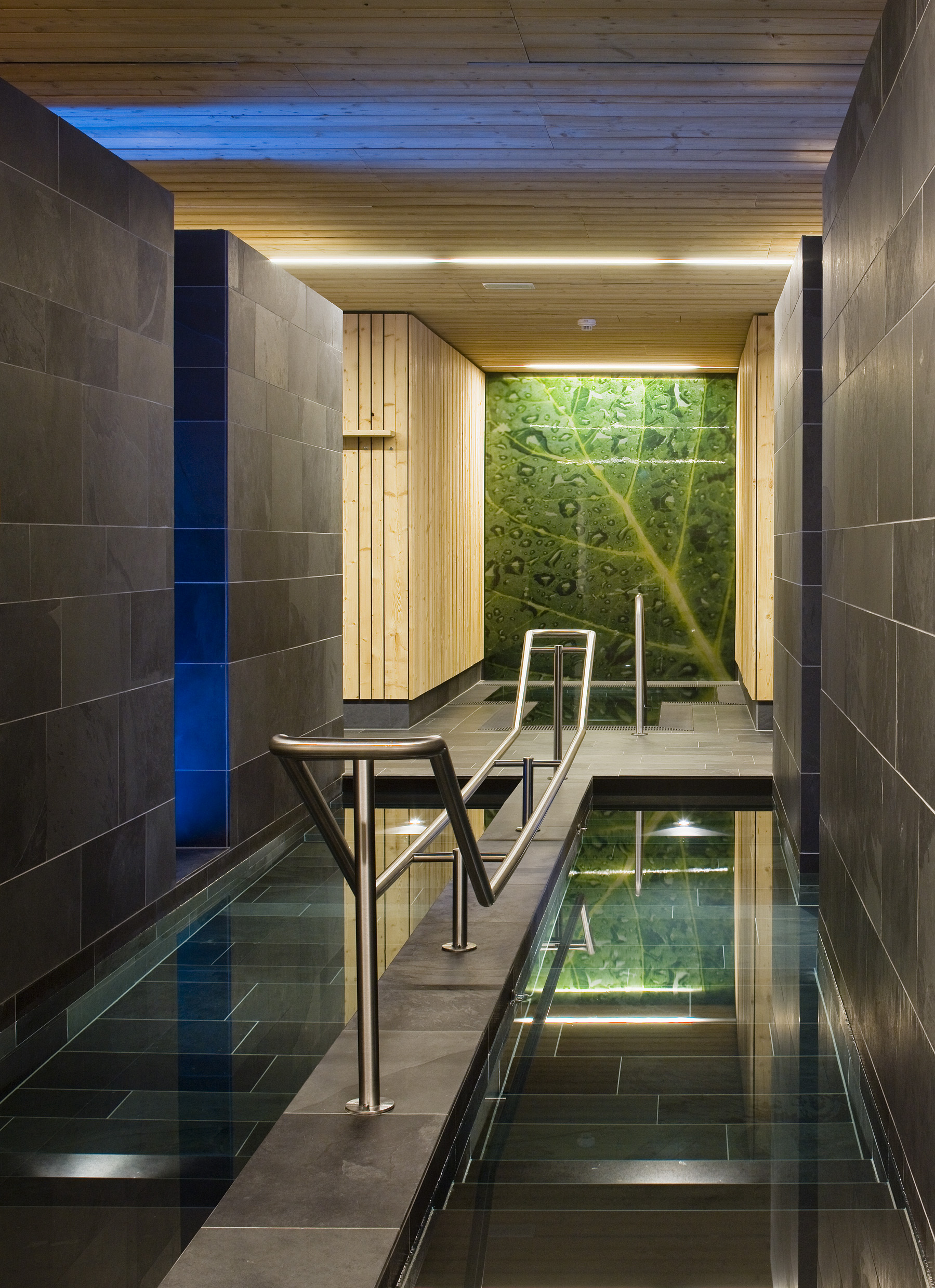 Das altgewachsene, geschichtsträchtige Hotel Gasthof Traube in Braz ist ein besonderes Projekt. Dem Zeitgeist und den Entwicklungen der Region und Gesellschaft immer gleich auf, entfaltet es sich weiter, baut um, erneuert, optimiert sich. Diese Bauphase zeigt den Empfang und die neue Eingangshalle, in der sich eine Bar, wie auch ein kleiner Shop befindet. Weil die Traube und wir um den hohen Wert der Gemütlichkeit wissen, findet sich inmitten all der unterschiedlichen Bereiche ein offener, großzügiger Kamin, der den Raum mit wärme und zartem Licht erfüllt. Im Anschluss an die Rezeption gelangt man in eine weitere, privatere Halle, welche die Überleitung zum Hellen Bade und Kosmetikbereich bildet. Das stilvolle, zurückhaltende Hallenbad ist ein separater Baukörper, Teil der Wellnessoase, ein Ort der Ruhe und Sinne. Die Glasfassade, vor allem aber das Aussenbecken bringen die atemberaubende Naturkulisse in den Innenraum. Der Kubatur des Bestands folgend, liegen in den geschossen darüber neue Gästezimmer.