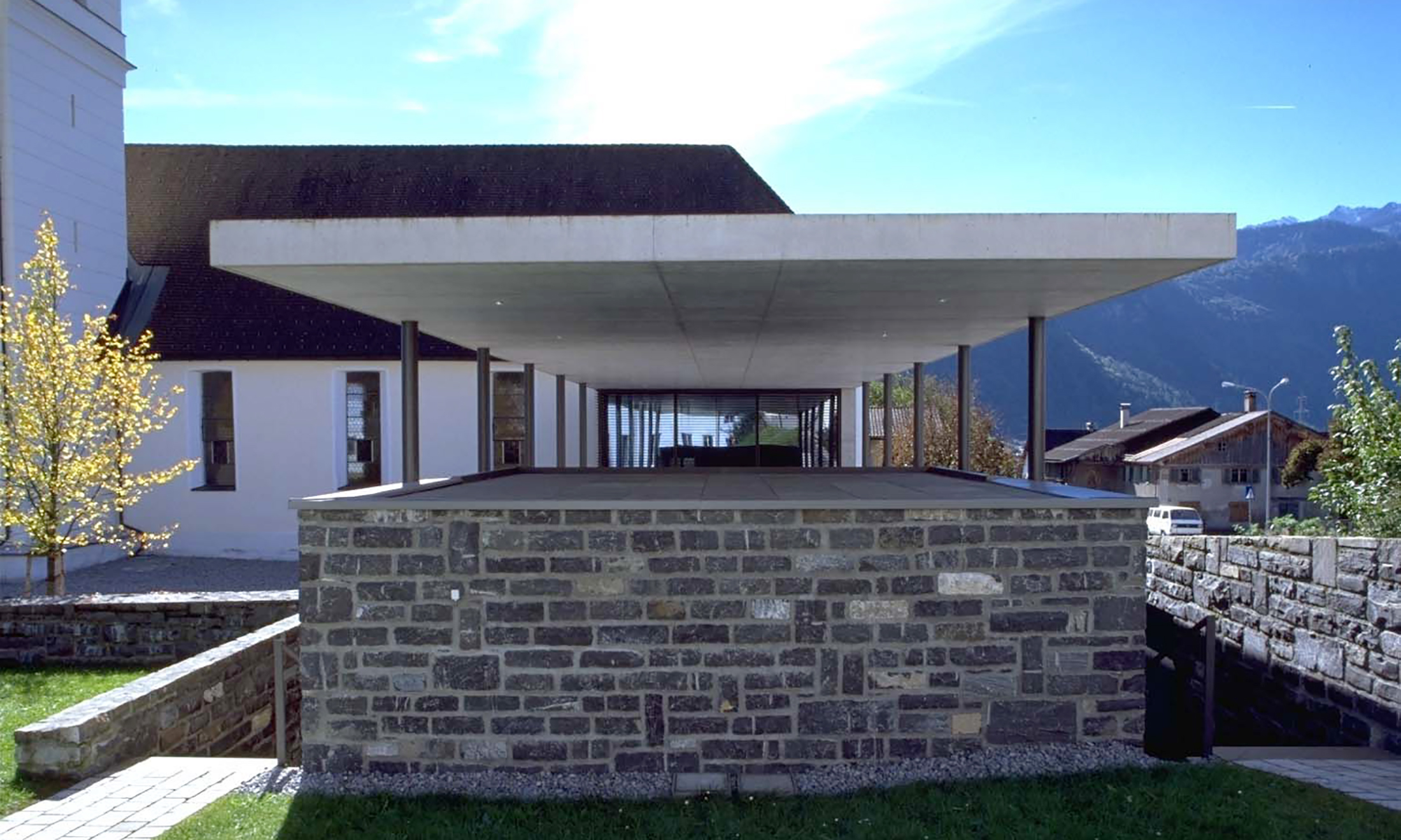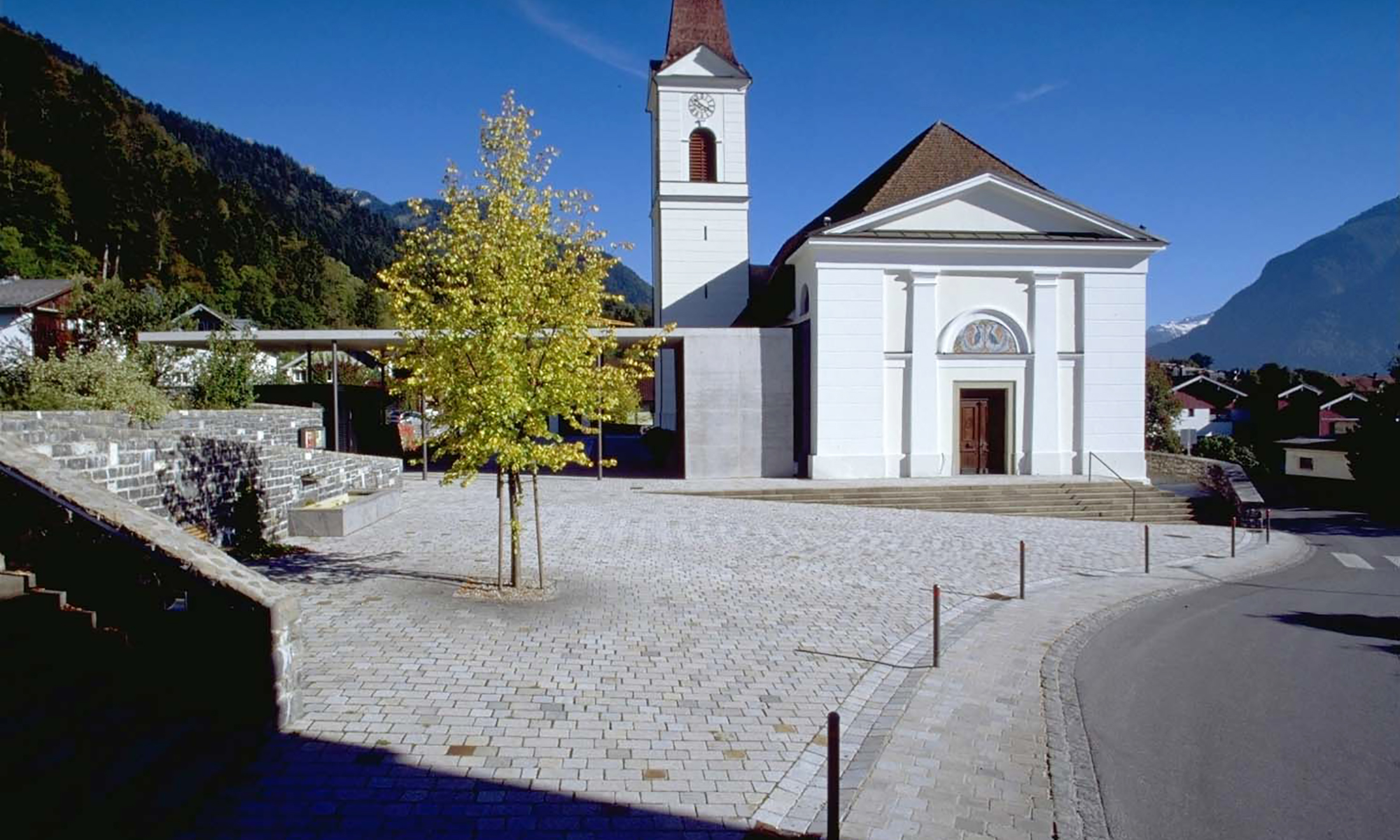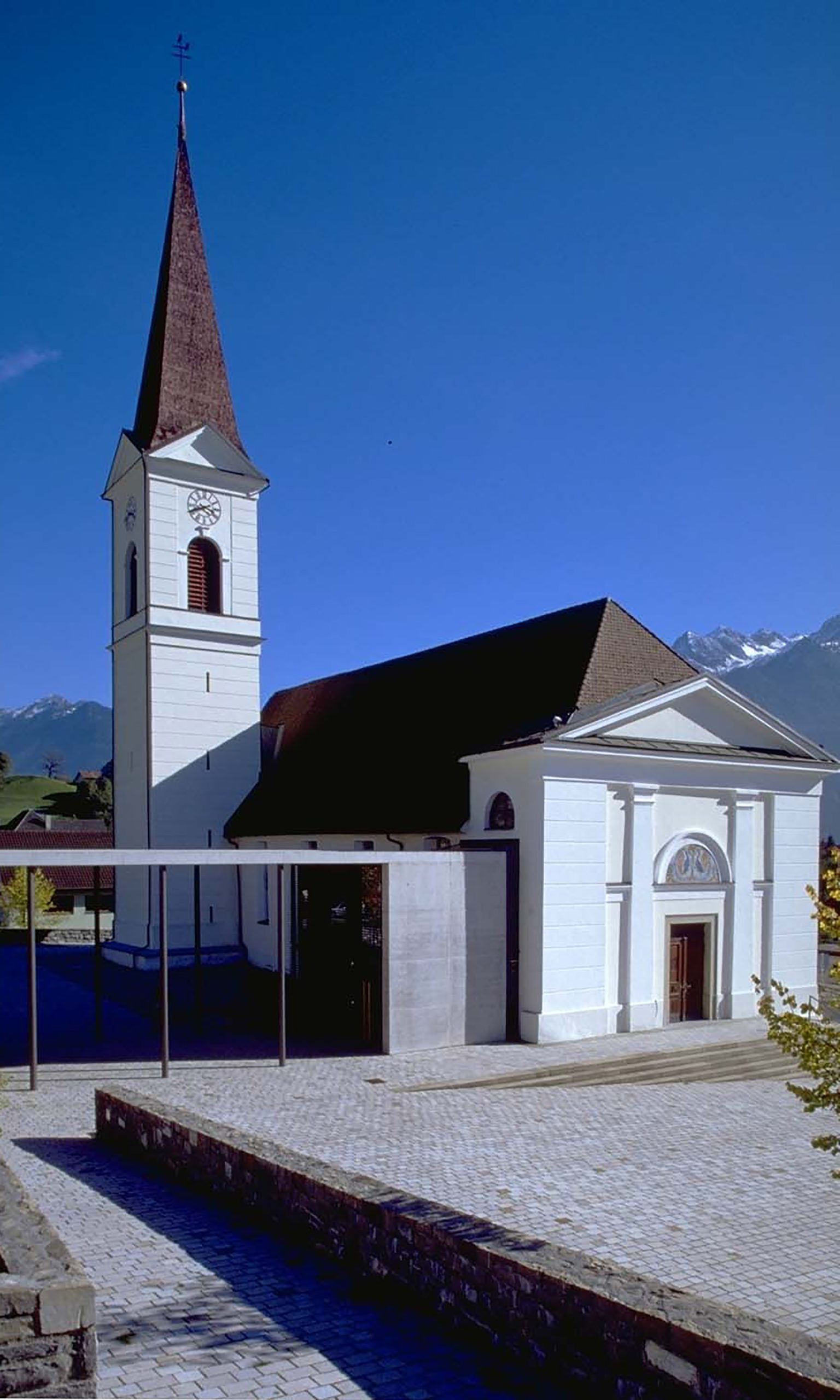 Die Pfarrkirche mit einem gotischen Chor und barockem Schiff wurde restauriert und erweitert, ohne die bestehende Substanz wesentlich zu verändern. Lediglich im Norden wurde mit Sichtbeton, Stahl und Glas ein neuer Anbau situiert, der sich klar von der historischen Bausubstanz absetzt. Die Beziehungen Kirche, Aufbahrung, windgeschützter Eingang und Emporenzugang wurden zusammengefasst. Durch diesen Anbau und durch das Versetzen des Kriegerdenkmals wurde der Außenraum neugestaltet, ein öffentlicher Platz an der Hauptstraße und ein ruhiger Platz hinter der Kirche über dem früheren Friedhof wurden gebildet. Im Kircheninnenraum wurden der Chor mit Altar, die Empore, die Sitzplätze neugestaltet, sowie die Fresken und barocken Altäre restauriert.