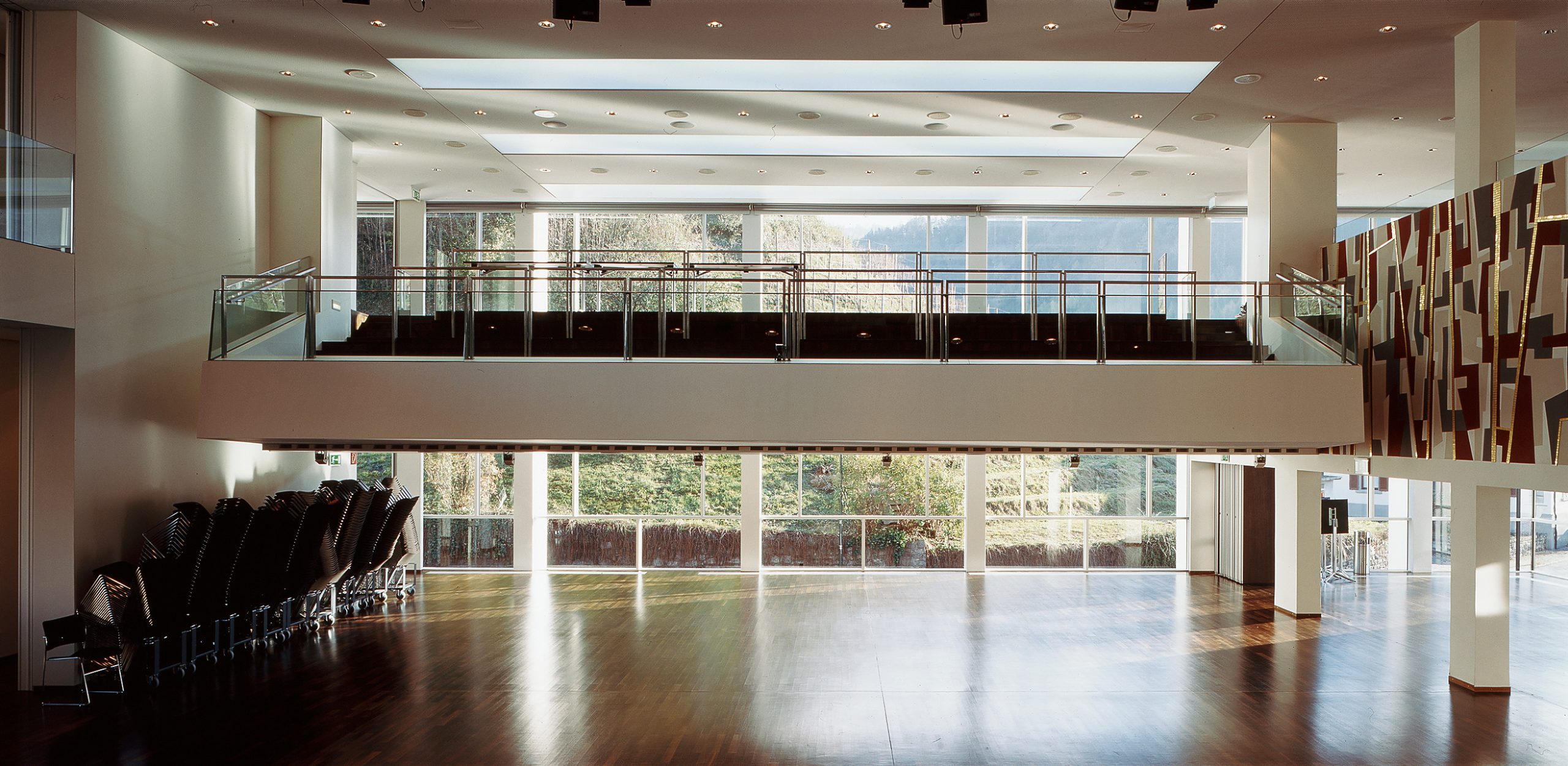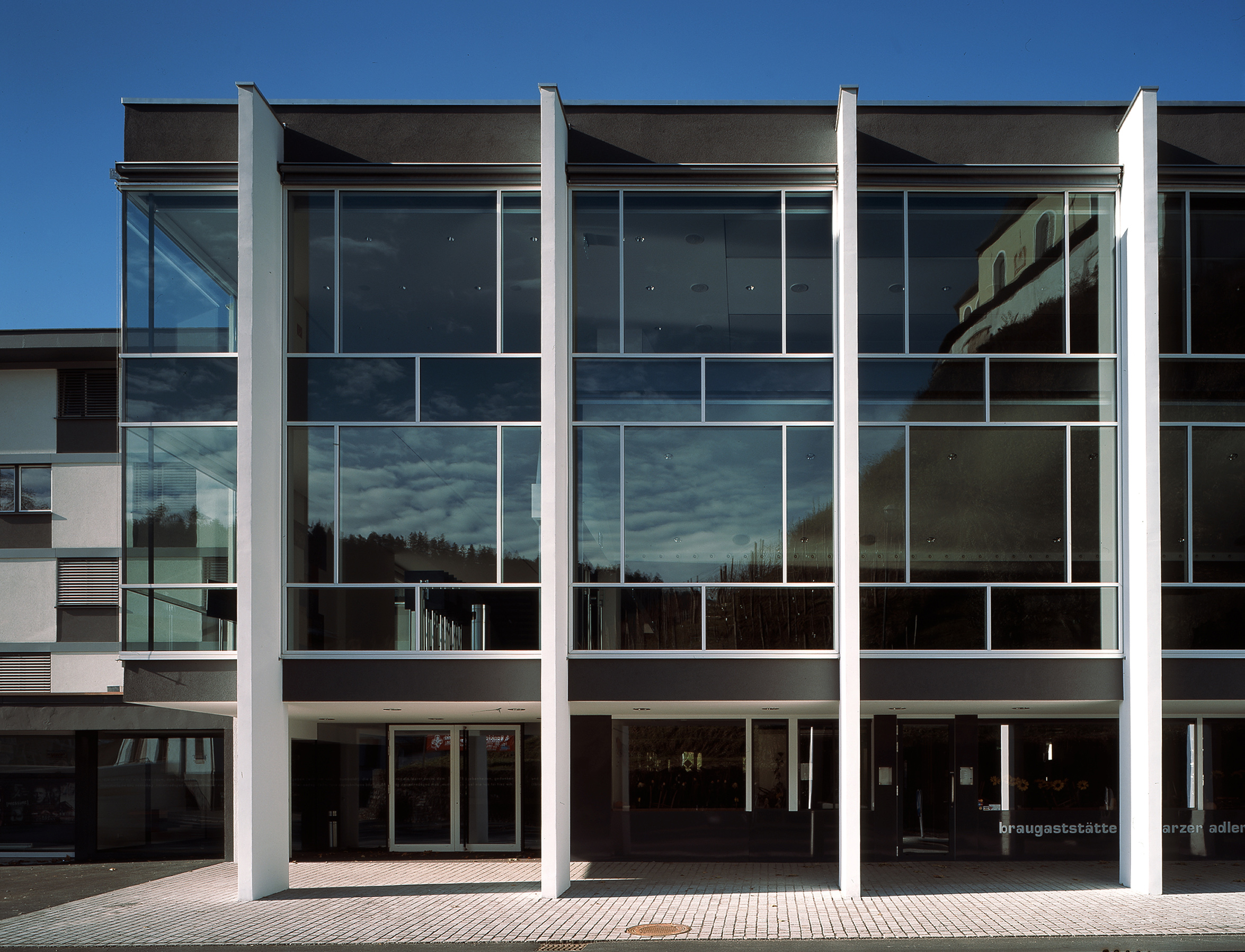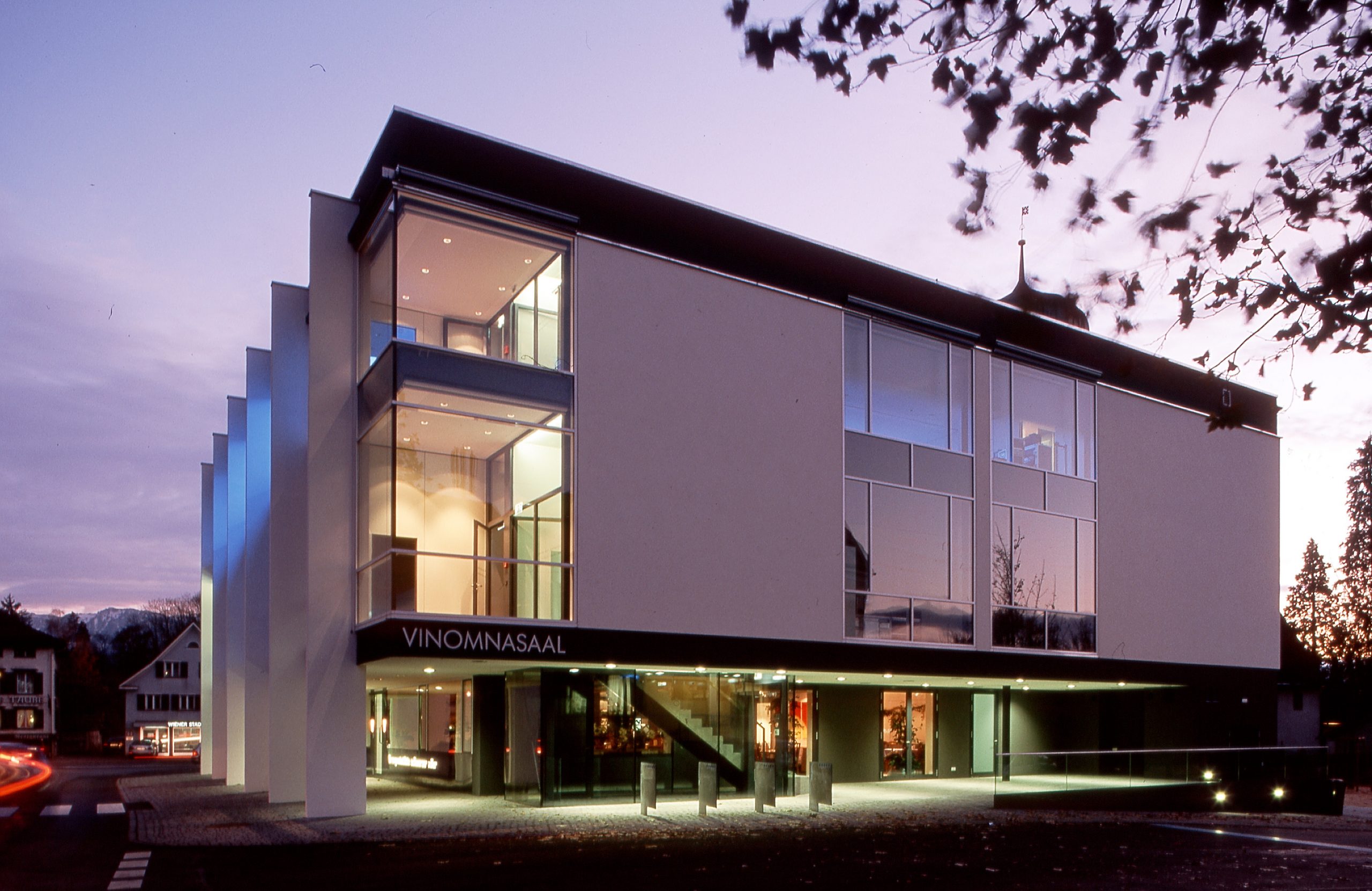 Die Erhaltung des Saales sowie der Standort waren umstritten. Zu groß schienen die Nachteile eines Saale im 1. Obergeschoss zu sein. Die Qualitäten des Gebäudes aus den 1960er Jahren wurden nicht erkannt. Zudem war eine Erweiterung nur in sehr begrenztem Maße möglich. Der bestehende Baukörper wurde in Richtung Postgebäude um eine Gebäudeachse erweitert. Damit wurden nutzbare Flächen auf allen Geschossen geschaffen. Im Erdgeschoss konnte die notwendige Fluchtstiege untergebracht werden, in den Obergeschossen abtrennbare Küchen- und Nebenräume geschaffen werden. Der Anbau wurde nicht als eigenständiger Bauteil verstanden, sondern, aus Respekt, in der Formensprache des Bestandes weitergeführt. Die Umbauarbeiten und Erweiterungen wurden behutsam vorgenommen. Das gesamte Gebäude wurde barrierefrei ausgeführt, durch ein neues Treppenhaus und Lifteinbauten. Die Lage des Saales im Ortszentrum sowie räumlich im 1. Obergeschoss bilden eine Bereicherung des Ortsbildes und Gemeindelebens. Die lichtdurchflutenden Räume bieten auch bei Tagesveranstaltungen schöne Ausblicke und in der Nacht wirkt das Haus von außen als heller, lebendiger, kultureller Mittelpunkt.